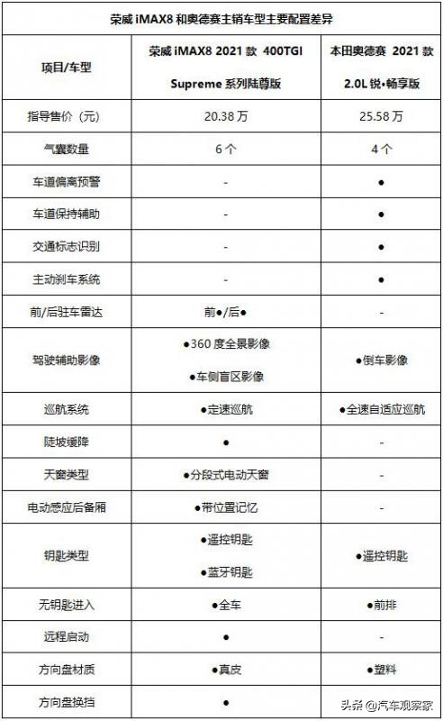 以上表格是榮威iMAX8和本田奧德賽全系主銷車型的主要配置差異,可以看差距還是非常明顯的,榮威iMAX8盡管售價低且定位更高,但并沒有在配置上打折扣,其豐富程度遠勝于本田奧德賽。