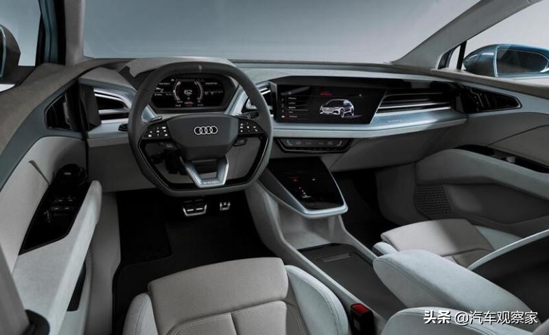 奧迪Q4 e-tron的內飾設計讓人眼前一亮。全新設計的三幅式方向盤,液晶儀表+12.3英寸懸浮式中控造型科幻感十足。坐在車內,猶如置身于一艘太空飛梭。不過,最值得關注的,還是觸碰式的換擋按鍵。奧迪如此激進的做法,必然招來廣泛爭議。不過,對于一臺定義未來的純電車,激進一點,沒什么不好的。