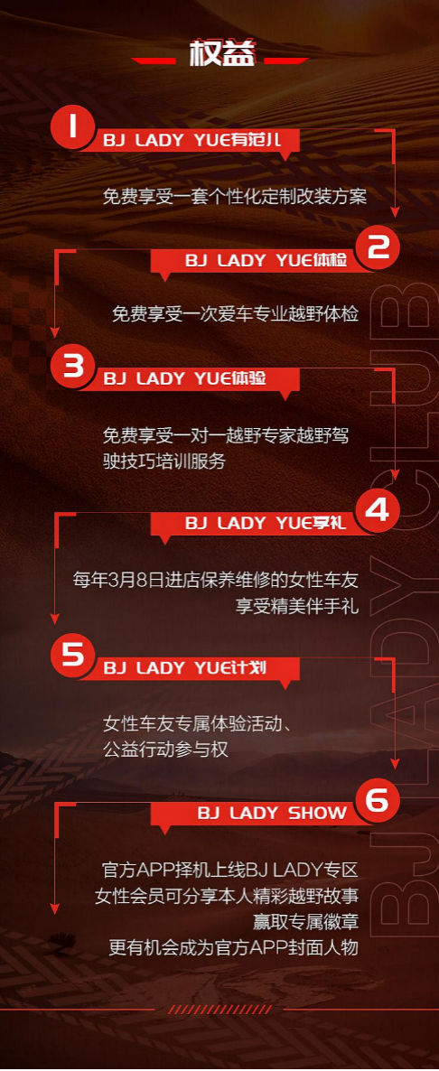 從另一個角度來說,組建BJ LADY CLUB對于女性車友多了一個交流平臺,女性之間可以取得最直接的聯(lián)系,就需求點和話題可以放松的聊到一起,輕松找到同好。 此外,在BJ LADY CLUB成立之際,北京越野還同時為女性車友帶來了六項權(quán)益。(見下圖)