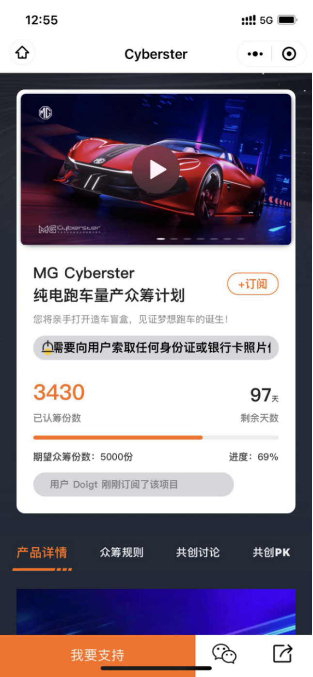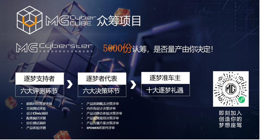 Cyberster采用“眾籌眾創”方式,目標為5000份(1份為1000元)。用戶可通過MG Live APP和上汽集團名爵小程序,登錄MG CyberCUBE用戶共創平臺,只需支付1000元“逐夢金”即可參與眾籌。一旦達到眾籌份數,MG Cyberster即啟動量產。