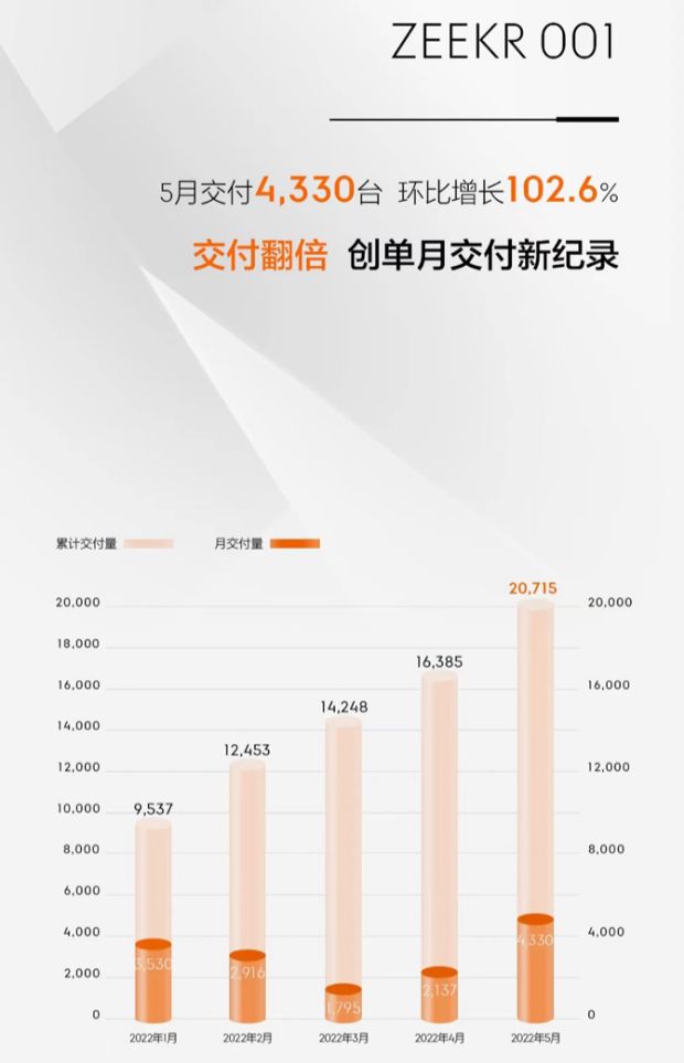 極氪品牌日前公布的數據顯示,今年5月份極氪001新車交付量為4330輛,環比4月份增長102.6%。