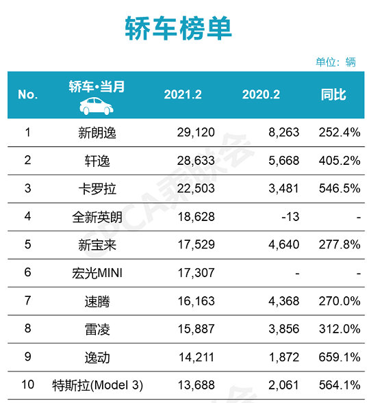 二月份迎來(lái)了農(nóng)歷新年,但車(chē)市卻是一年之中的最“淡季”,根據(jù)乘聯(lián)會(huì)最新零售銷(xiāo)量數(shù)據(jù)統(tǒng)計(jì),2月份國(guó)內(nèi)狹義乘用車(chē)市場(chǎng)銷(xiāo)量達(dá)117.7萬(wàn)輛,同比增長(zhǎng)371.9%,環(huán)比下降45.5%。其中轎車(chē)2月份轎車(chē)銷(xiāo)量55.8萬(wàn)輛,同比增長(zhǎng)345.1%,環(huán)比下降47.2%。 雖然相比去年有了增長(zhǎng),但是環(huán)比還是下降了不少。下面就來(lái)看看轎車(chē)銷(xiāo)量榜單的TOP10車(chē)型。